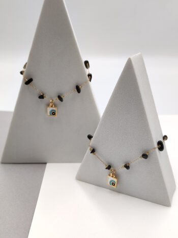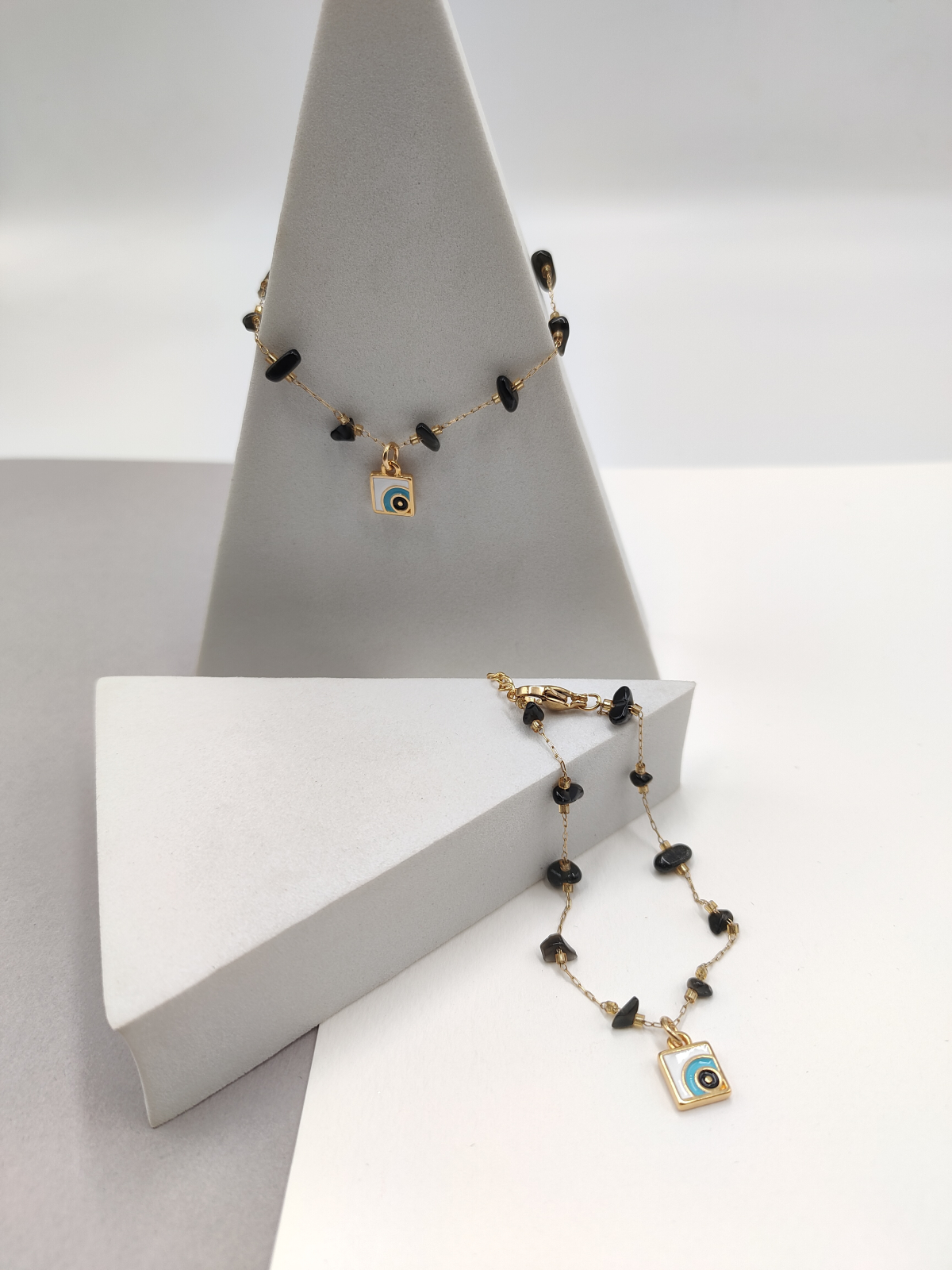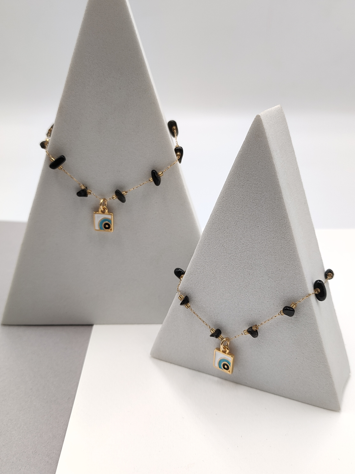 Βραχιόλι ατσάλινο με γυάλινες χάντρες, επίχρυσο στοιχείο με σχέδιο μάτι και σμάλτο.