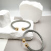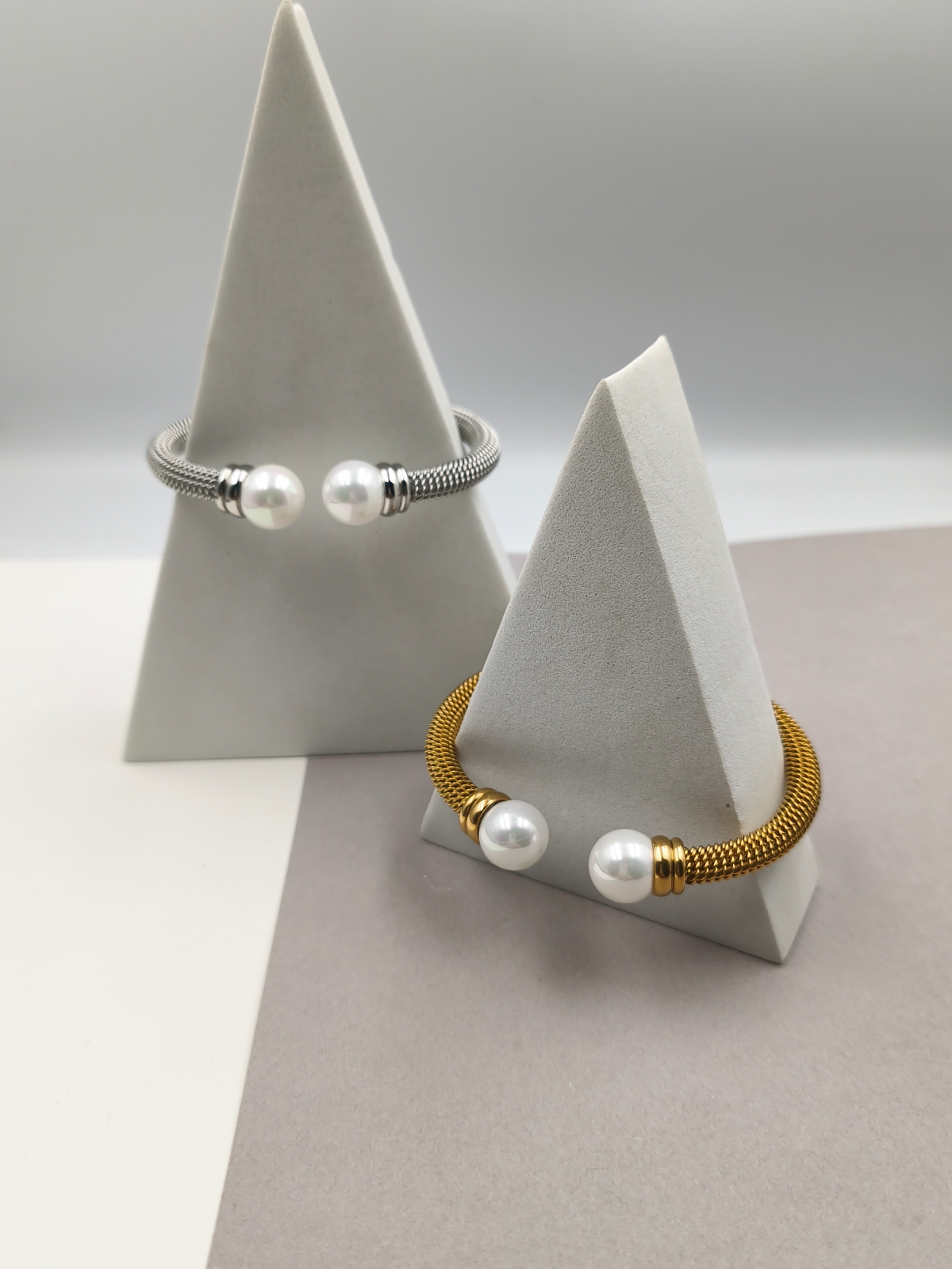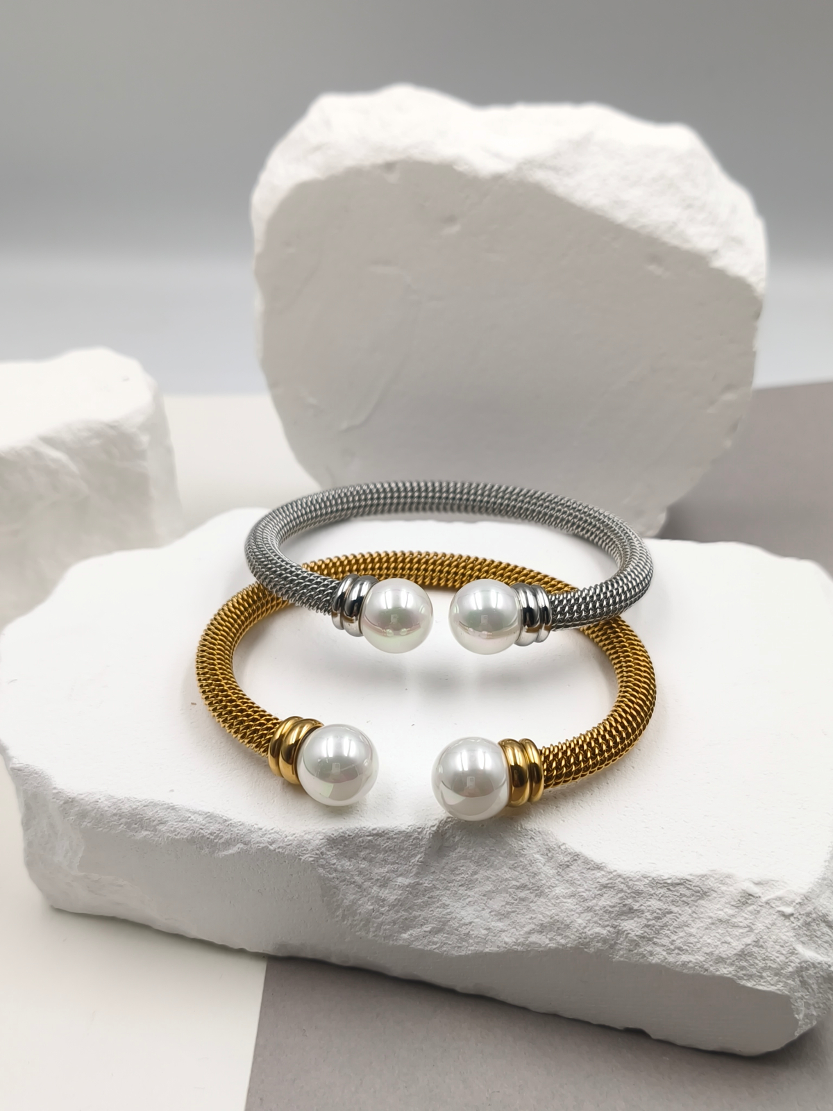 Βραχιόλι-cuff ατσάλινο με πλεκτή βάση σε χρυσό ή ασημί χρώμα, και πέρλες στα τελειώματα.