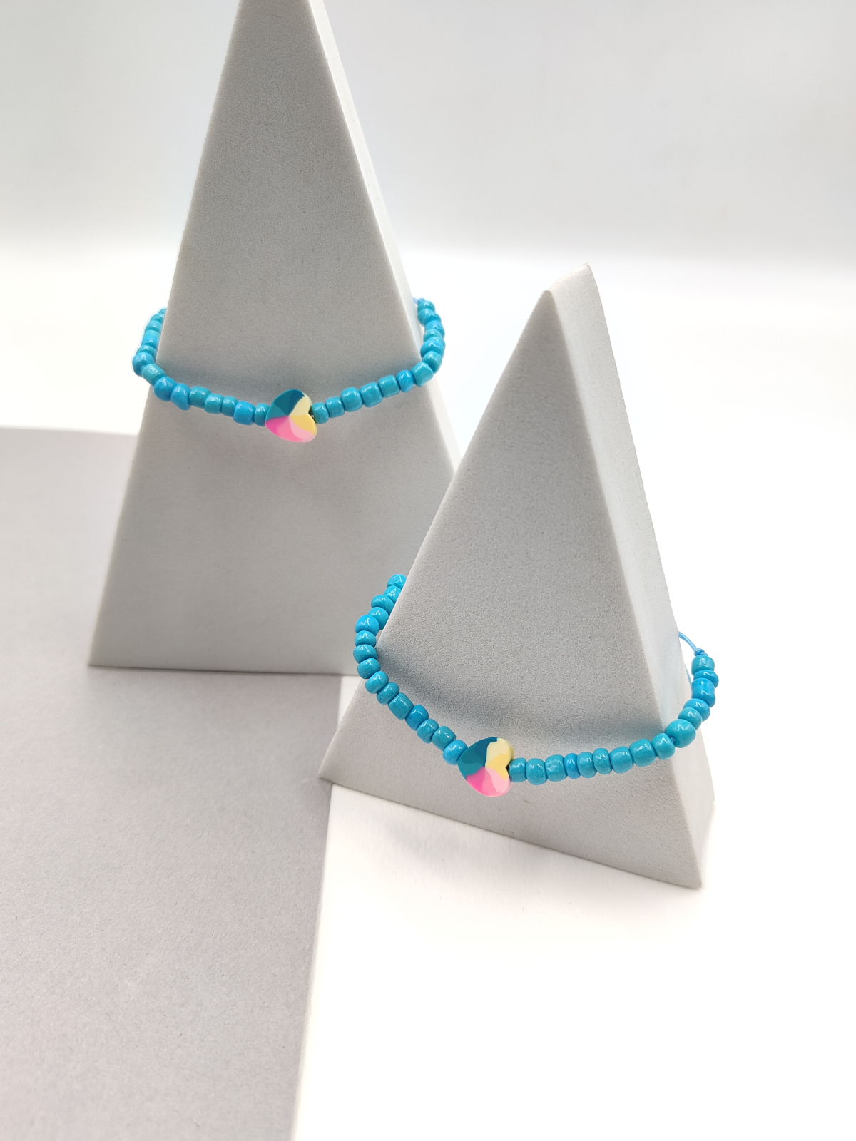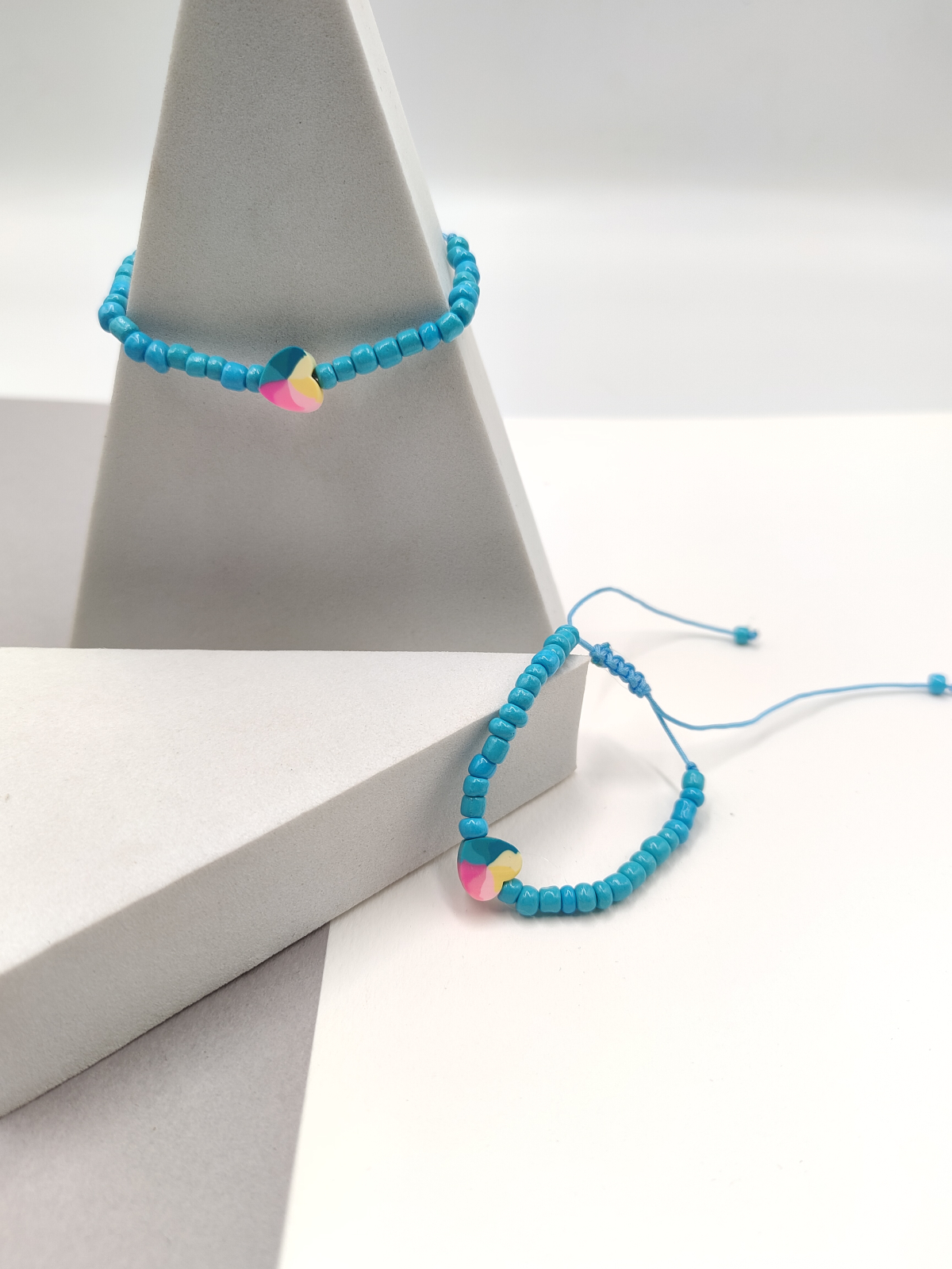 Βραχιόλι χειροποίητο με κορδόνι, γαλάζιες γυάλινες χάντρες και πολύχρωμη καρδιά από φίμο. Δέσιμο μακραμέ για αυξομείωση του μήκους.