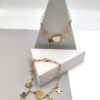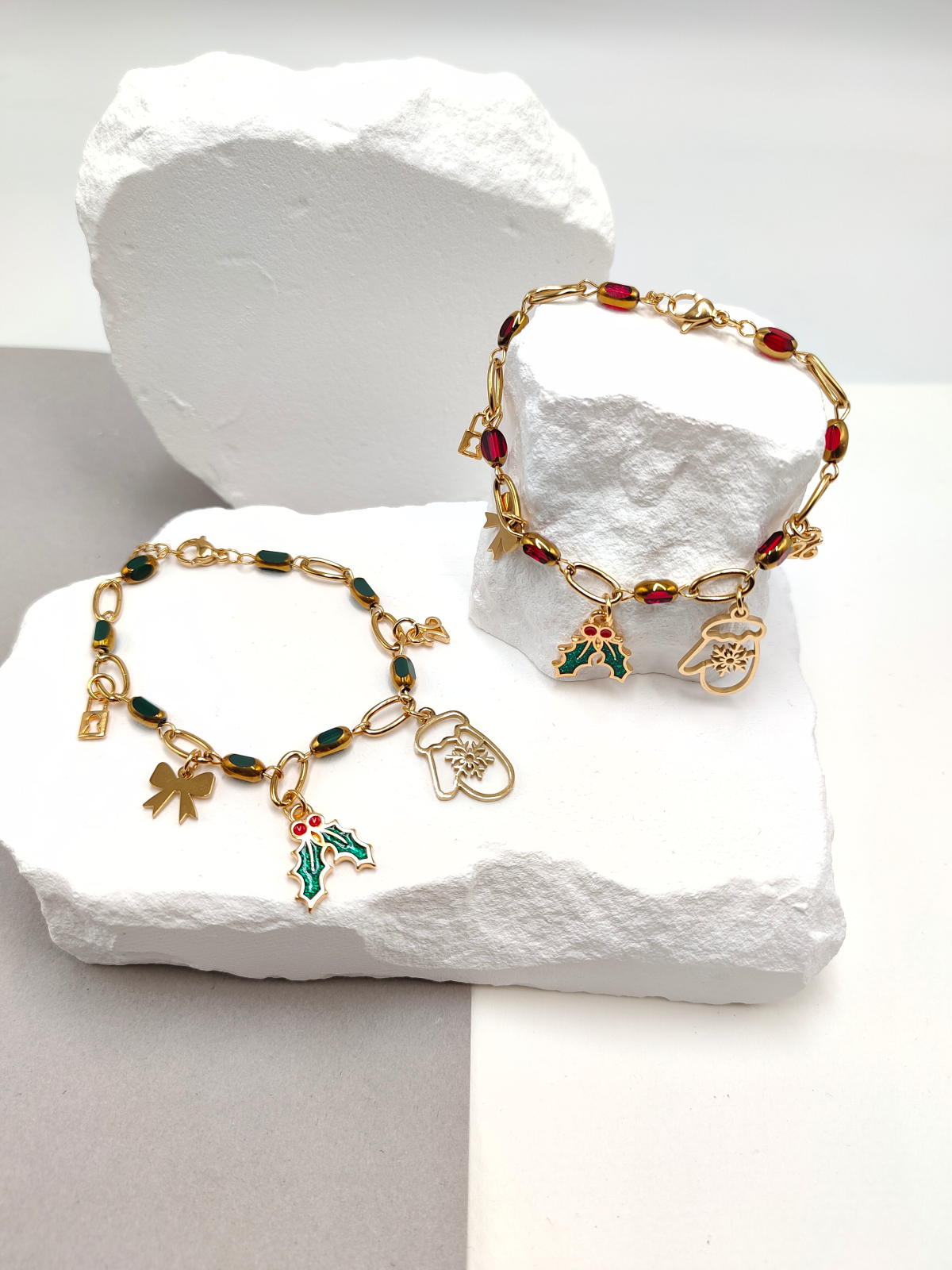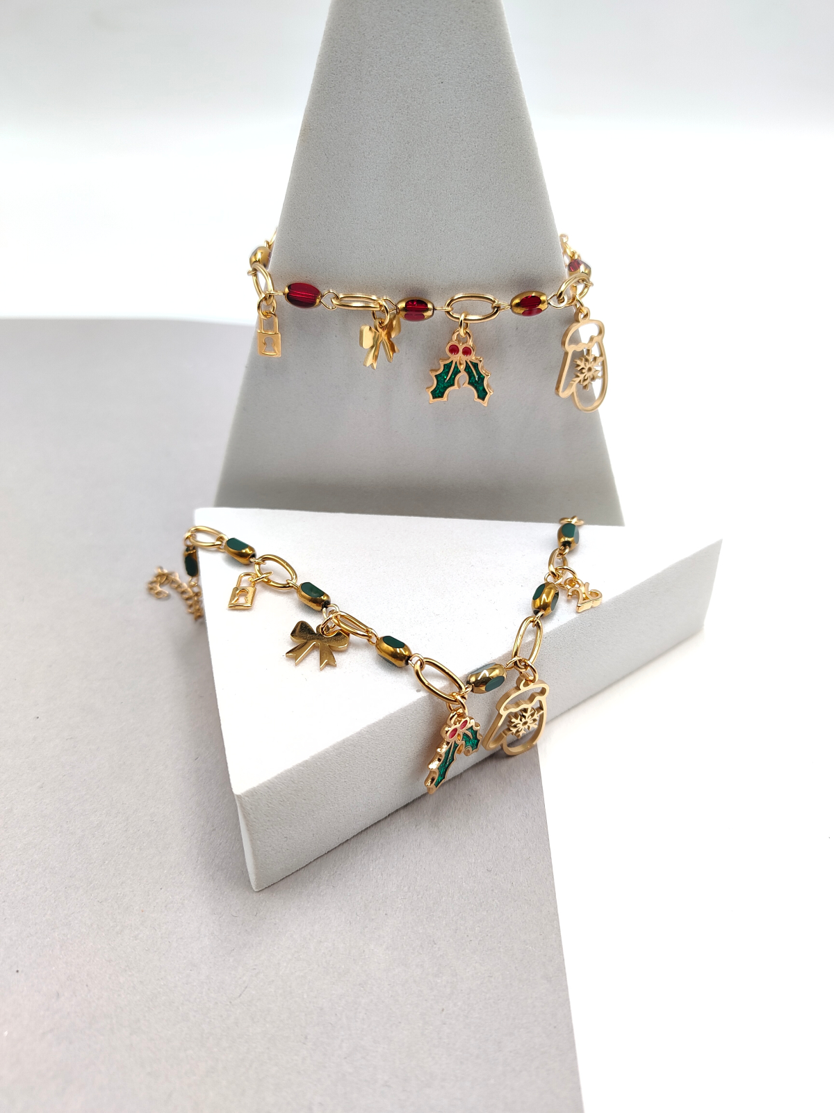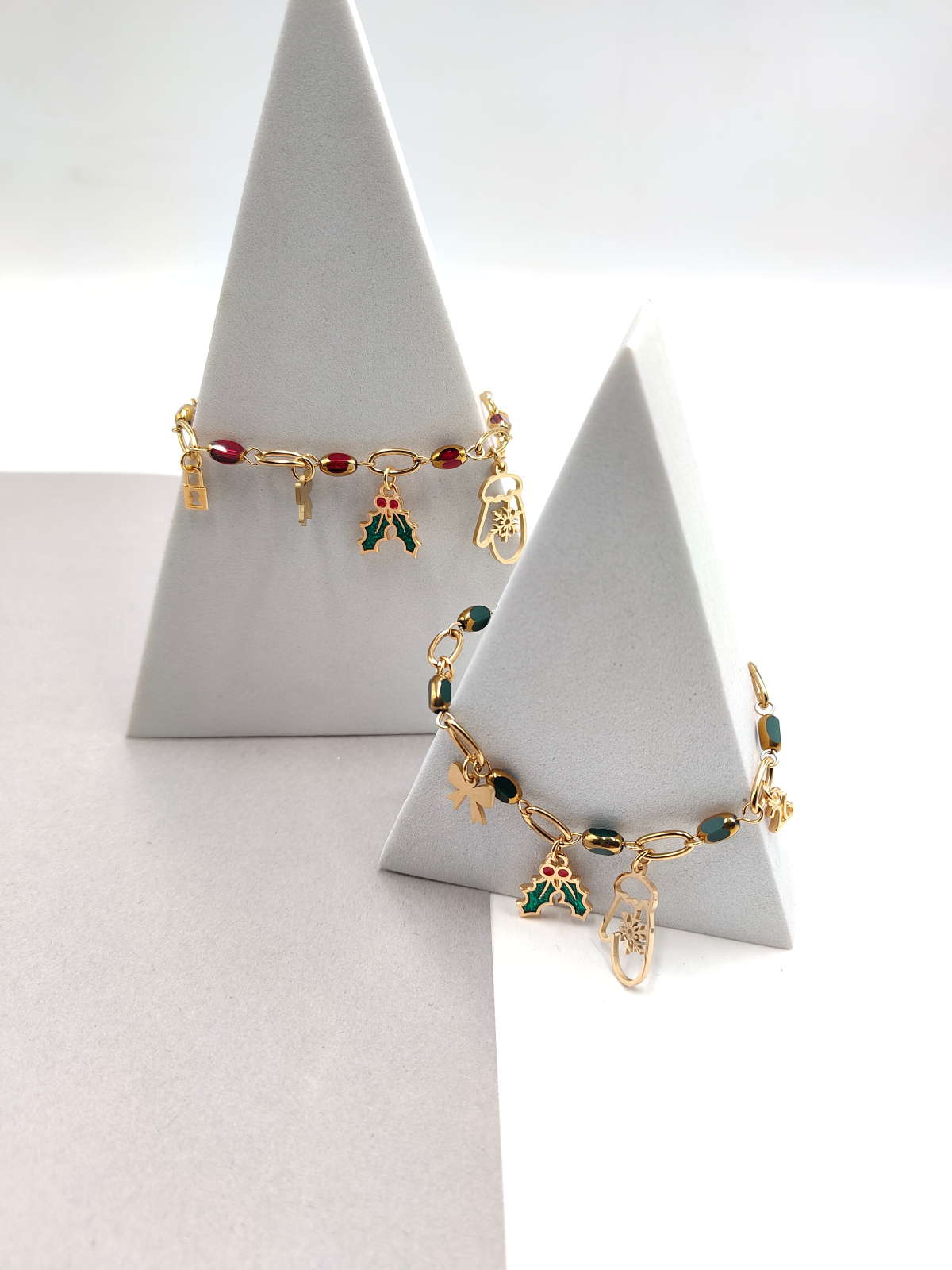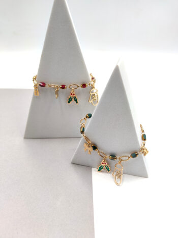 Βραχιόλι lucky charm ατσάλινο με χρυσή βάση, επίχρυσα κρεμαστά στοιχεία με σμάλτο και κρύσταλλα σε πράσινο ή κόκκινο χρώμα.