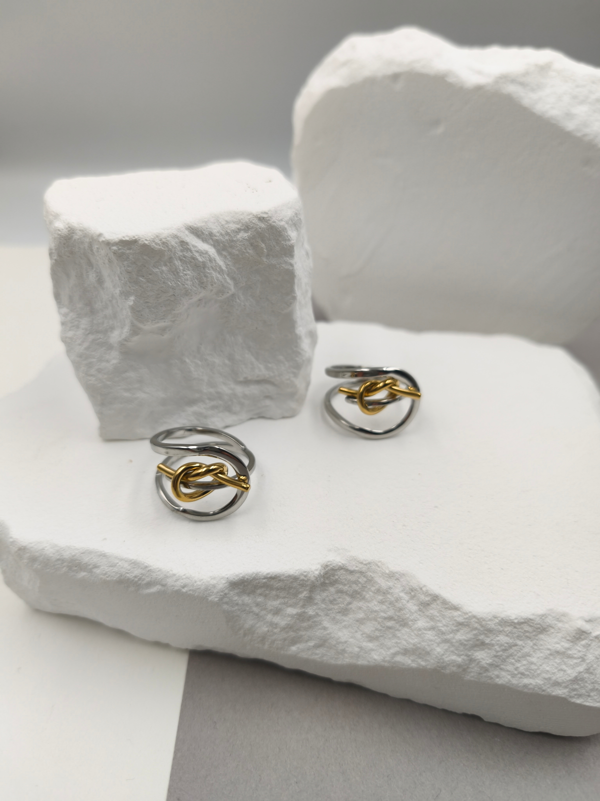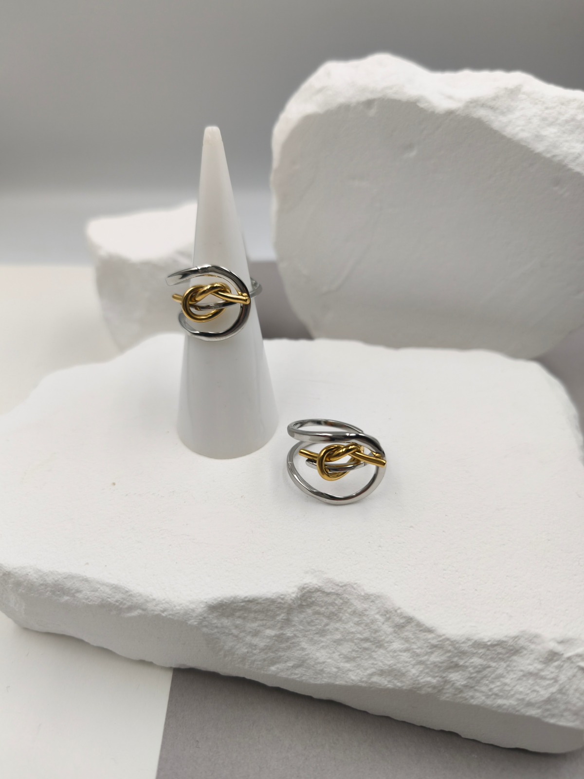 Δαχτυλίδι ατσάλινο με σχέδιο κόμπο, σε ασημί χρώμα με χρυσή λεπτομέρεια.