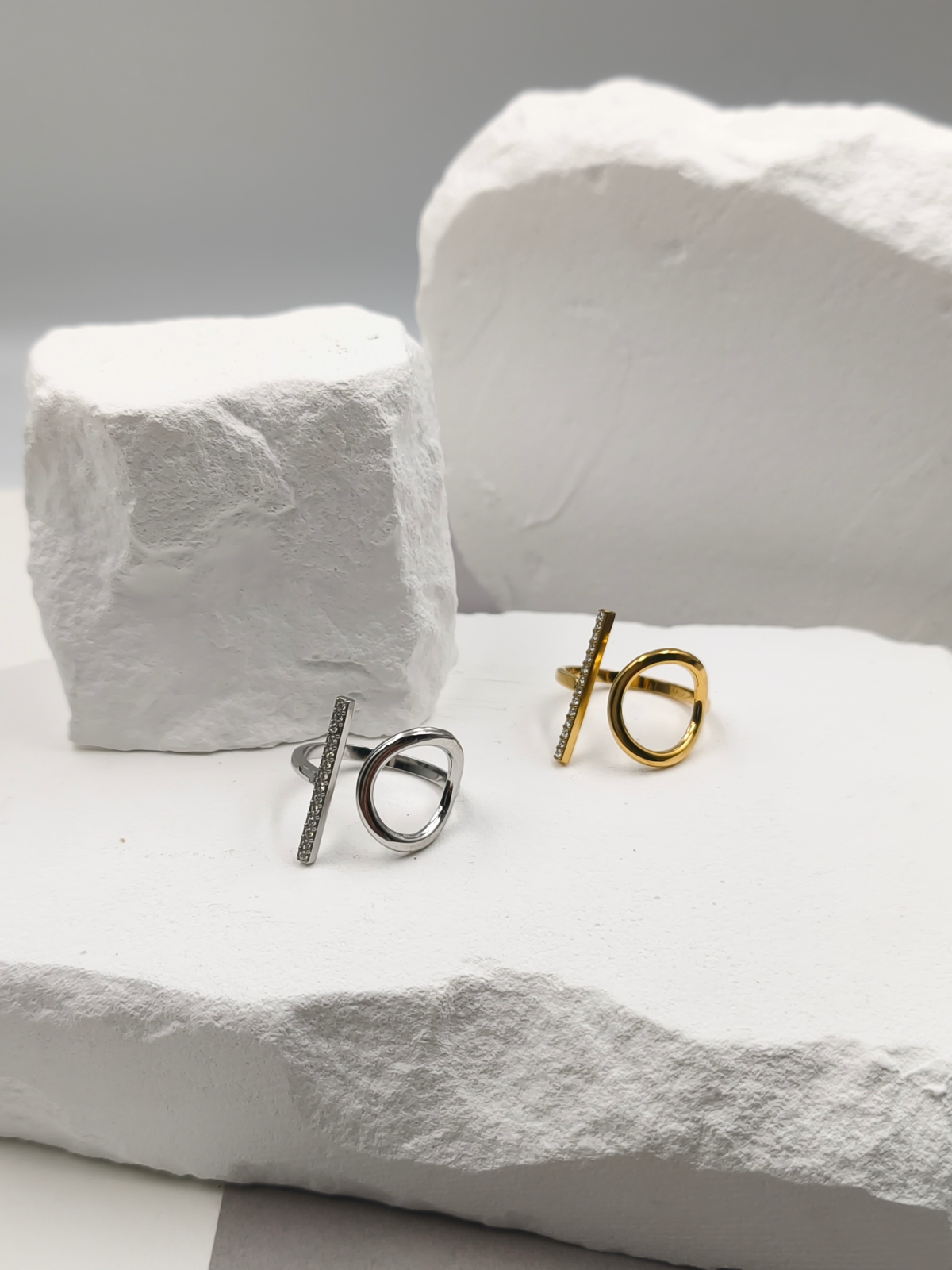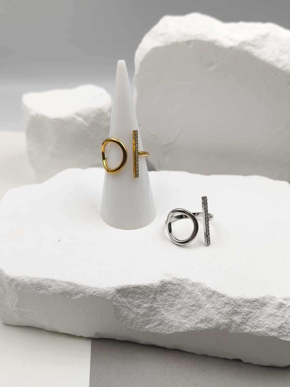 Δαχτυλίδι ατσάλινο με άνοιγμα, κύκλο και μπάρα με zircon, σε χρυσό ή ασημί χρώμα.