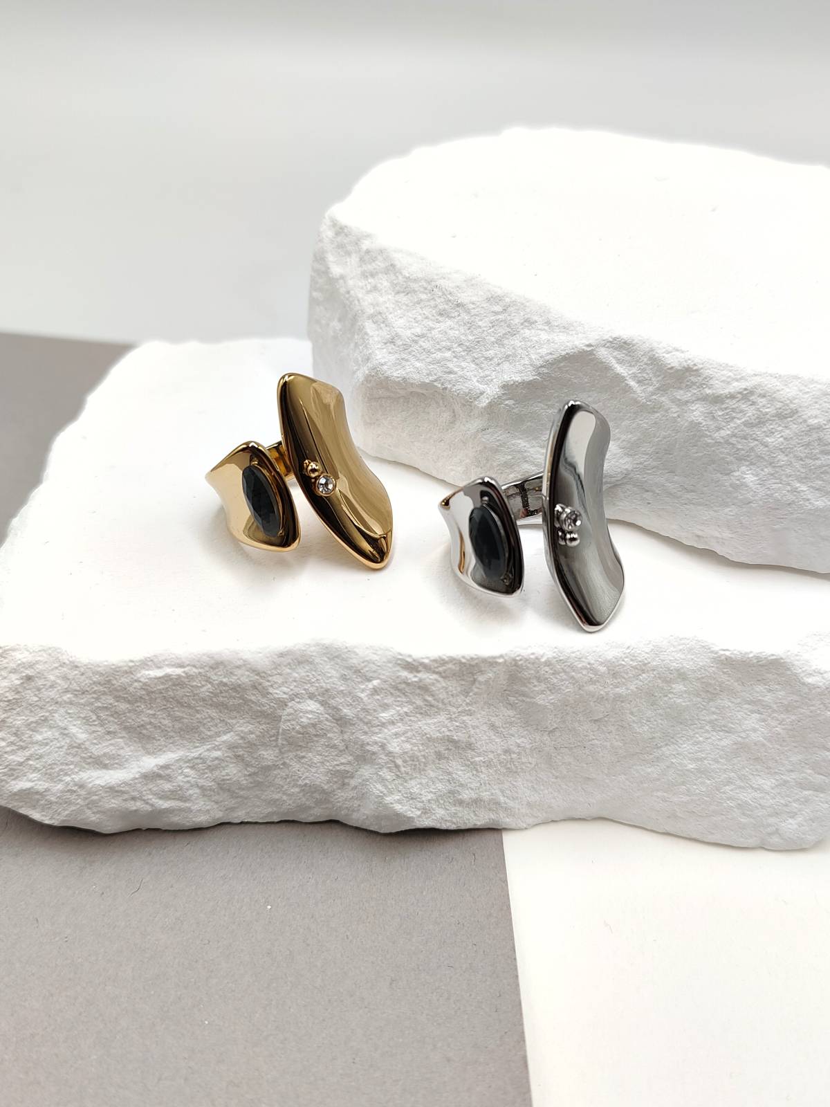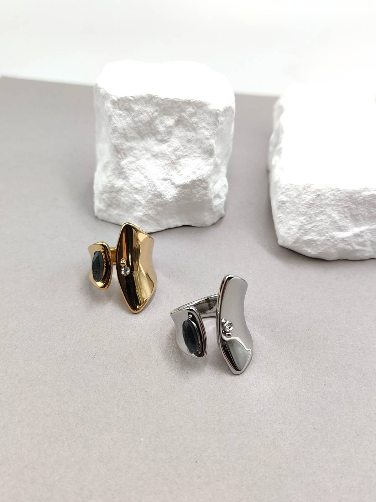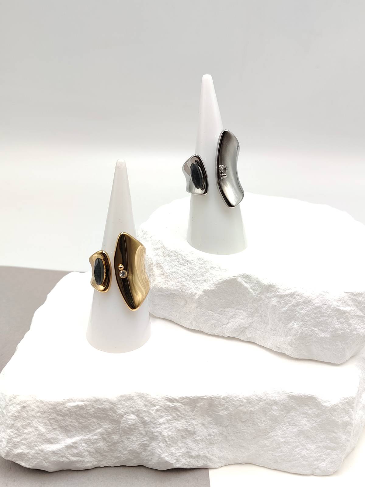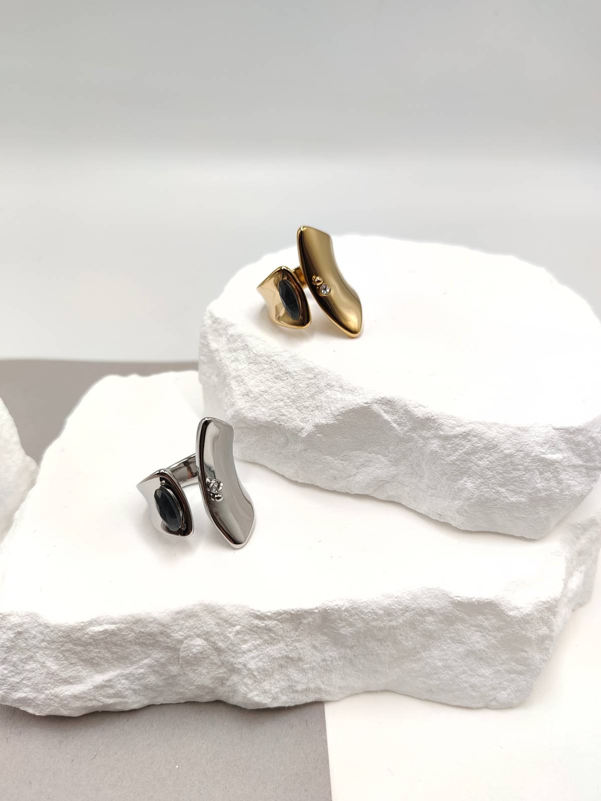 Δαχτυλίδι ατσάλινο με άνοιγμα και πέτρες zircon, σε χρυσό ή ασημί χρώμα.