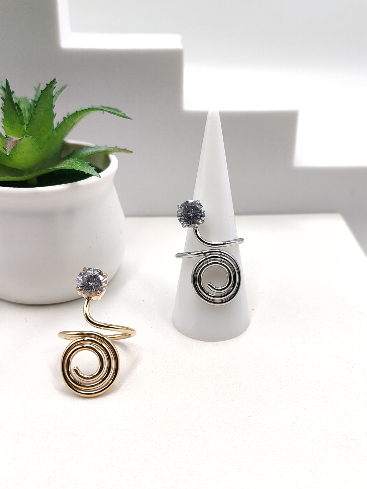 Δαχτυλίδι ατσάλινο με μεγάλη σπείρα και στρας, σε χρυσό ή ασημί χρώμα.