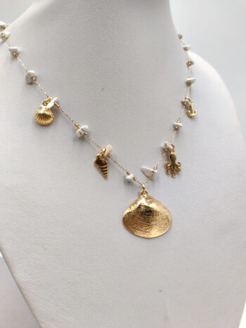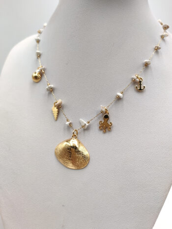 Κολιέ με ατσάλινη αλυσίδα, χάντρες χαολίτη και επίχρυσα κρεμαστά καλοκαιρινά στοιχεία.