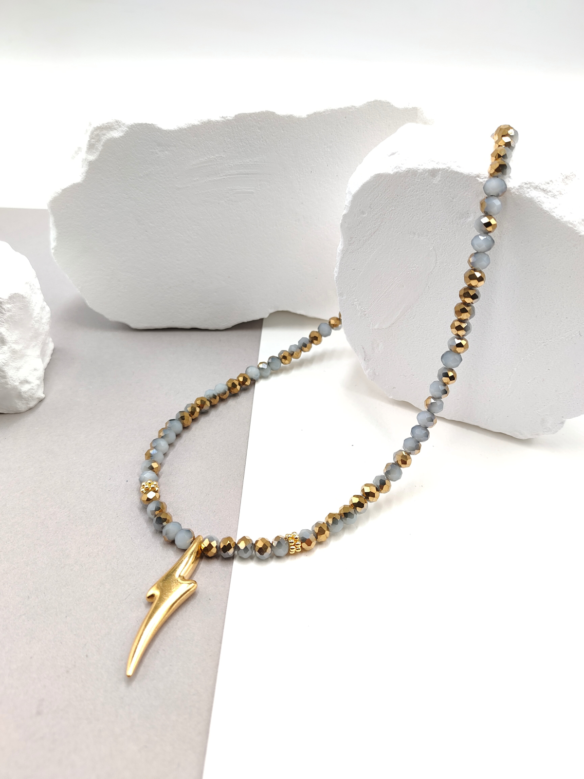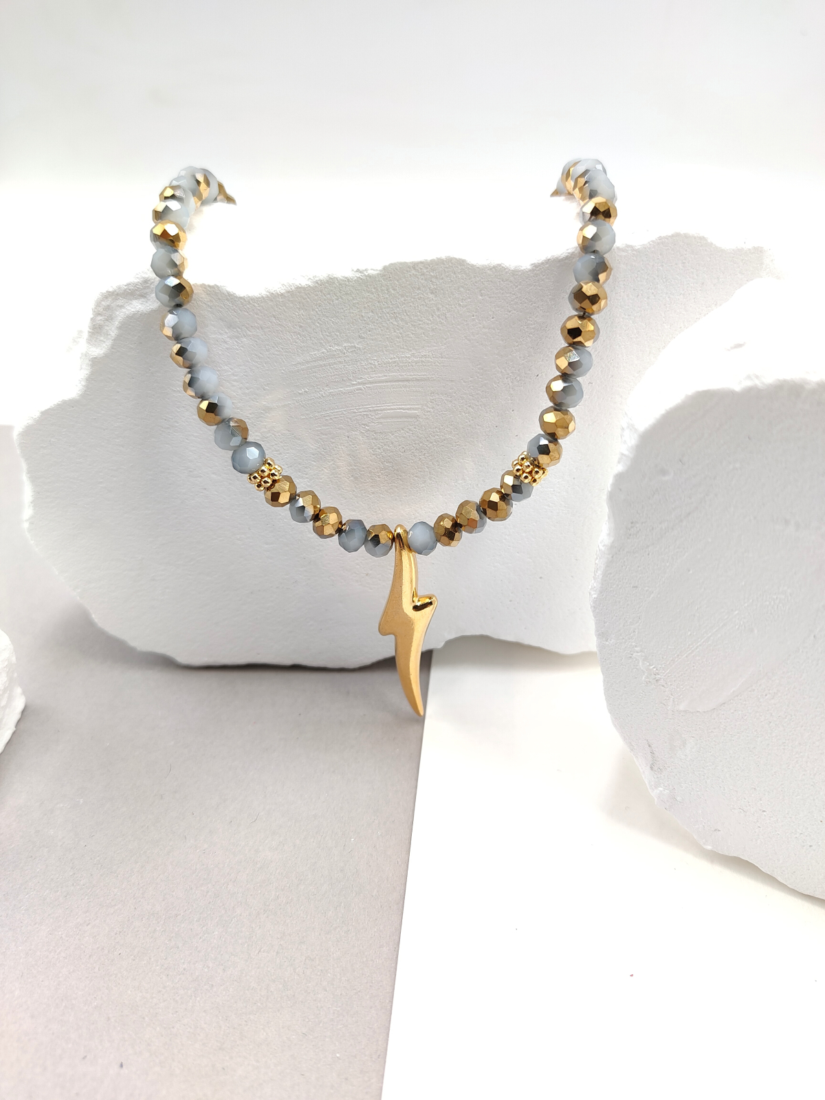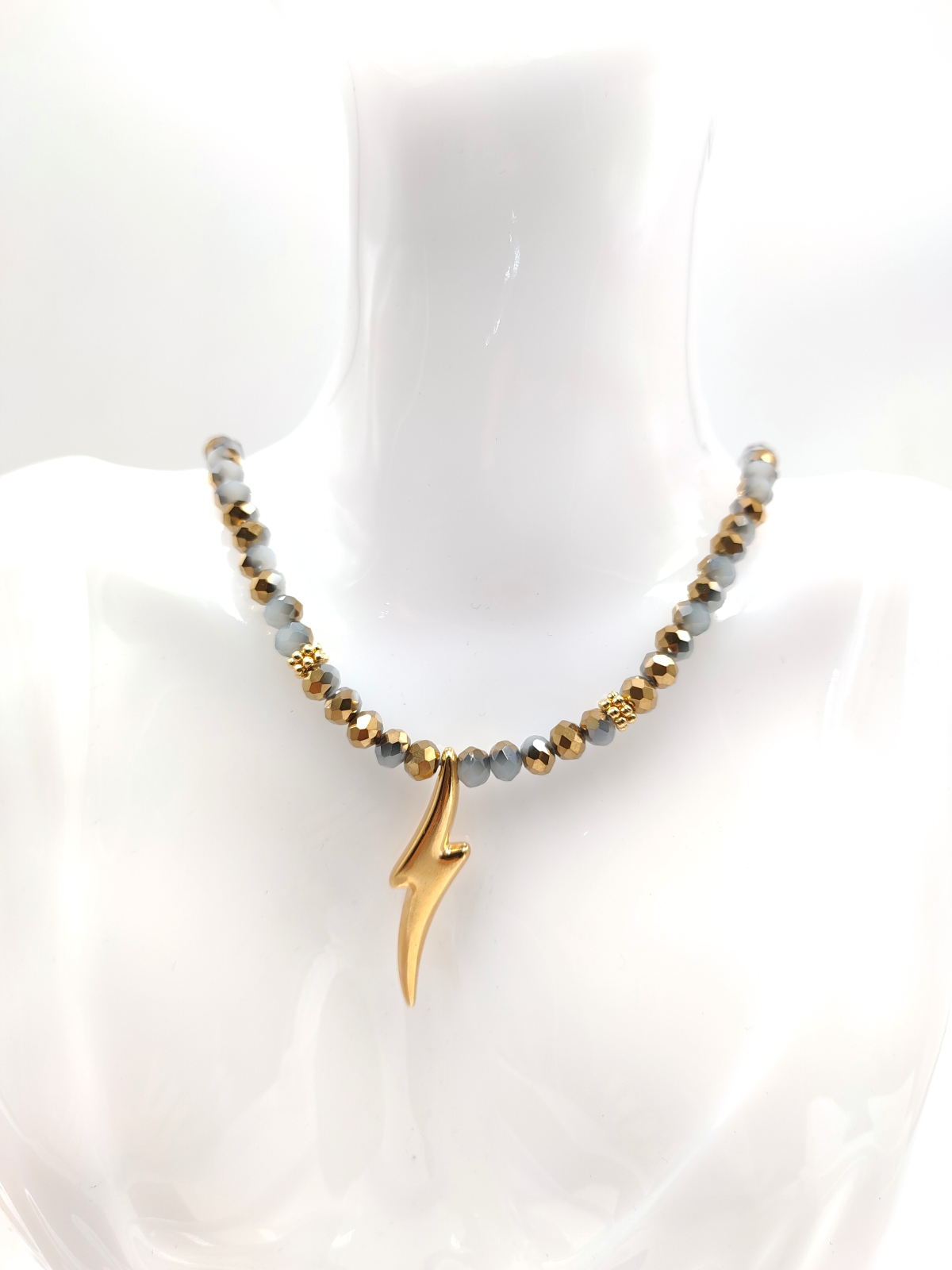 Κολιέ χειροποίητο με κρύσταλλα χάντρες και κρεμαστή επίχρυση αστραπή. Κούμπωμα και προέκταση από ανοξείδωτο ατσάλι.