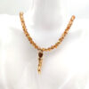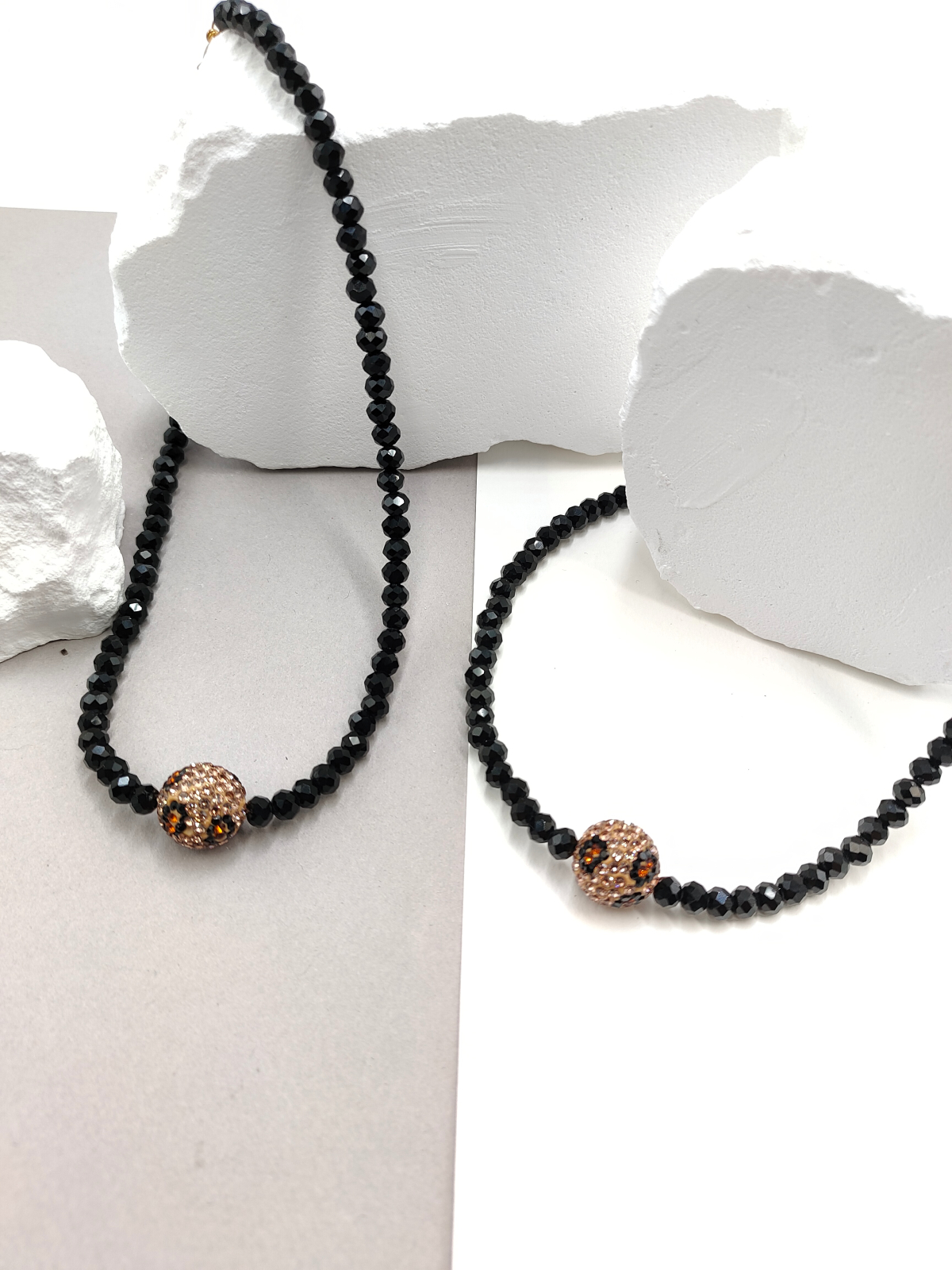 Κολιέ χειροποίητο με κρύσταλλα χάντρες και στρογγυλό στοιχείο με στρας και animal print. Κούμπωμα και προέκταση από ανοξείδωτο ατσάλι.