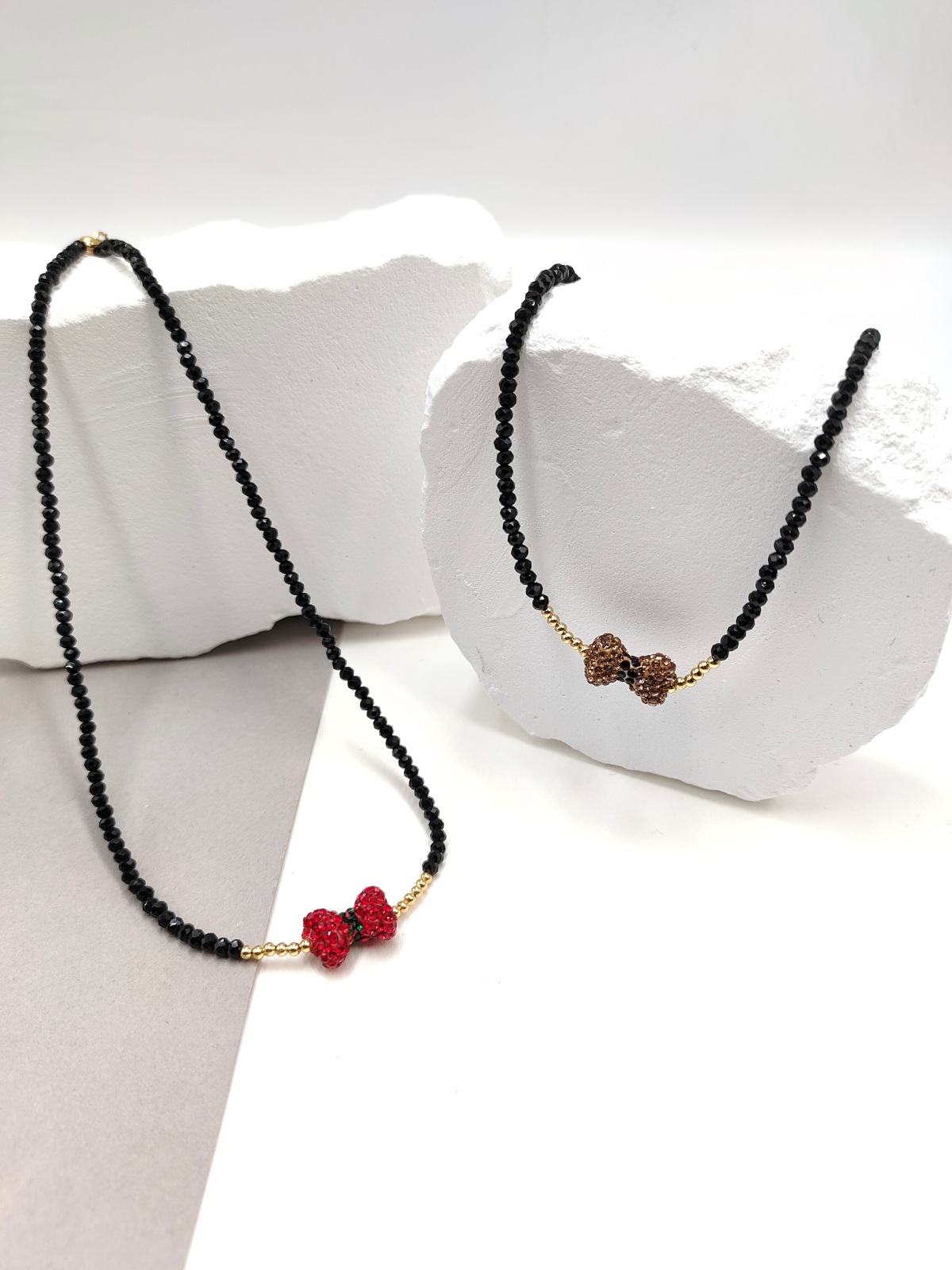 Κολιέ με πολυγωνικά κρύσταλλα χάντρες και φιόγκο, σε μαύρο ή καφέ χρώμα. Κούμπωμα και προέκταση από ανοξείδωτο ατσάλι.
