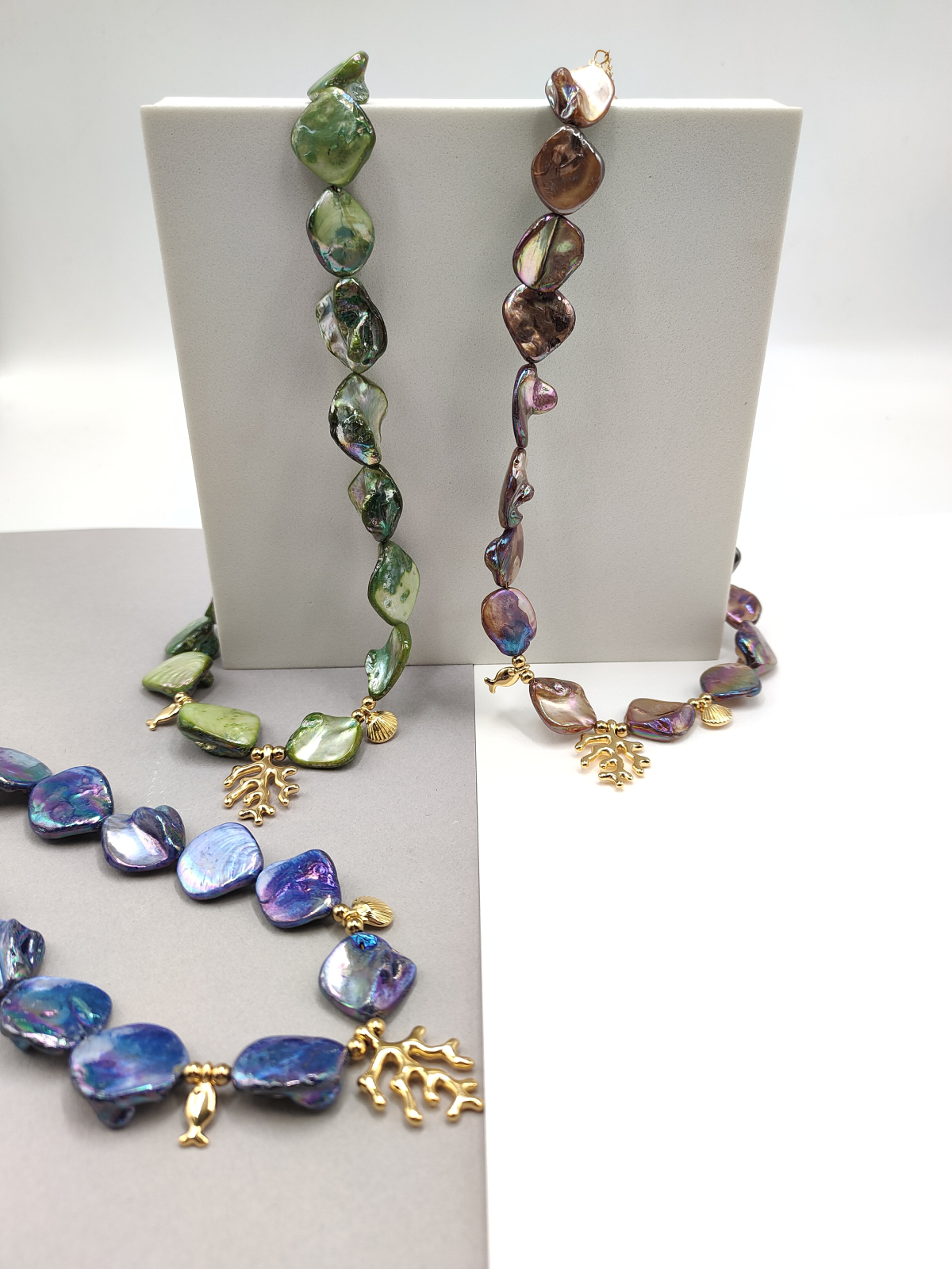 Κολιέ χειροποίητο με χάντρες από φίλντισι και επίχρυσα στοιχεία, σε τρεις υπέροχες αποχρώσεις. Κούμπωμα και προέκταση από ανοιξείδωτο ατσάλι.