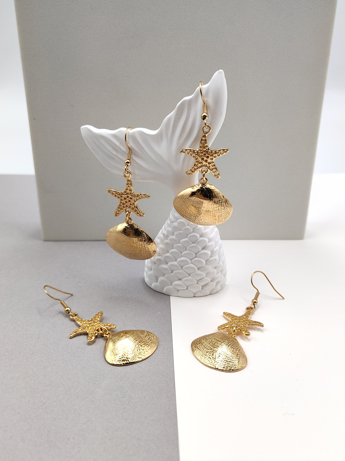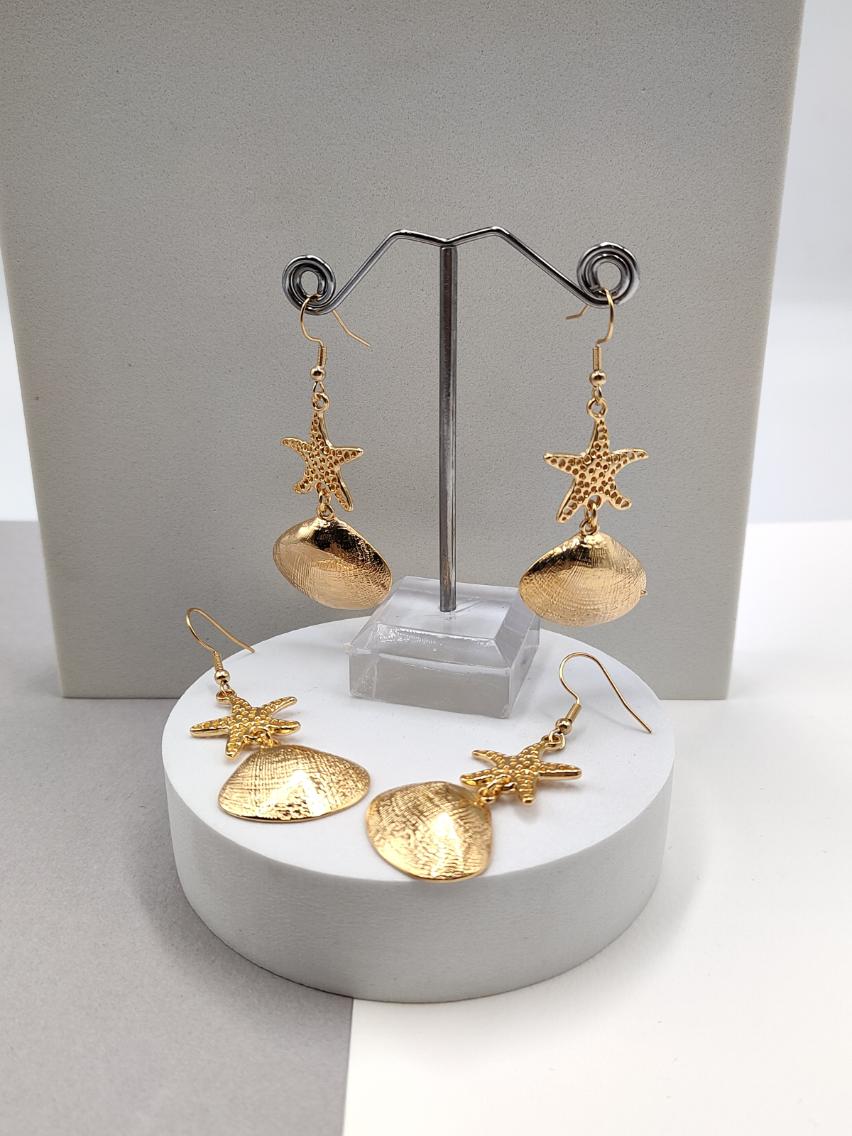 Σκουλαρίκια ατσάλινα με κρεμαστά κοχύλια και αστερίες, σε χρυσό χρώμα.