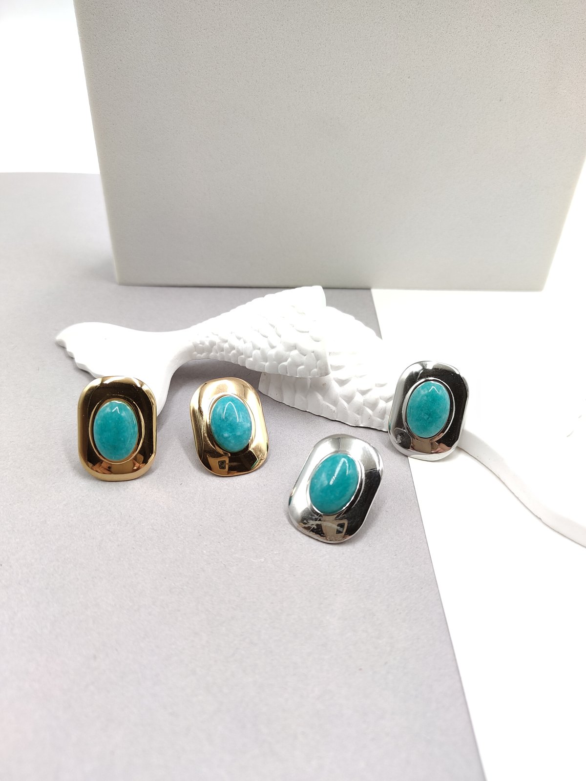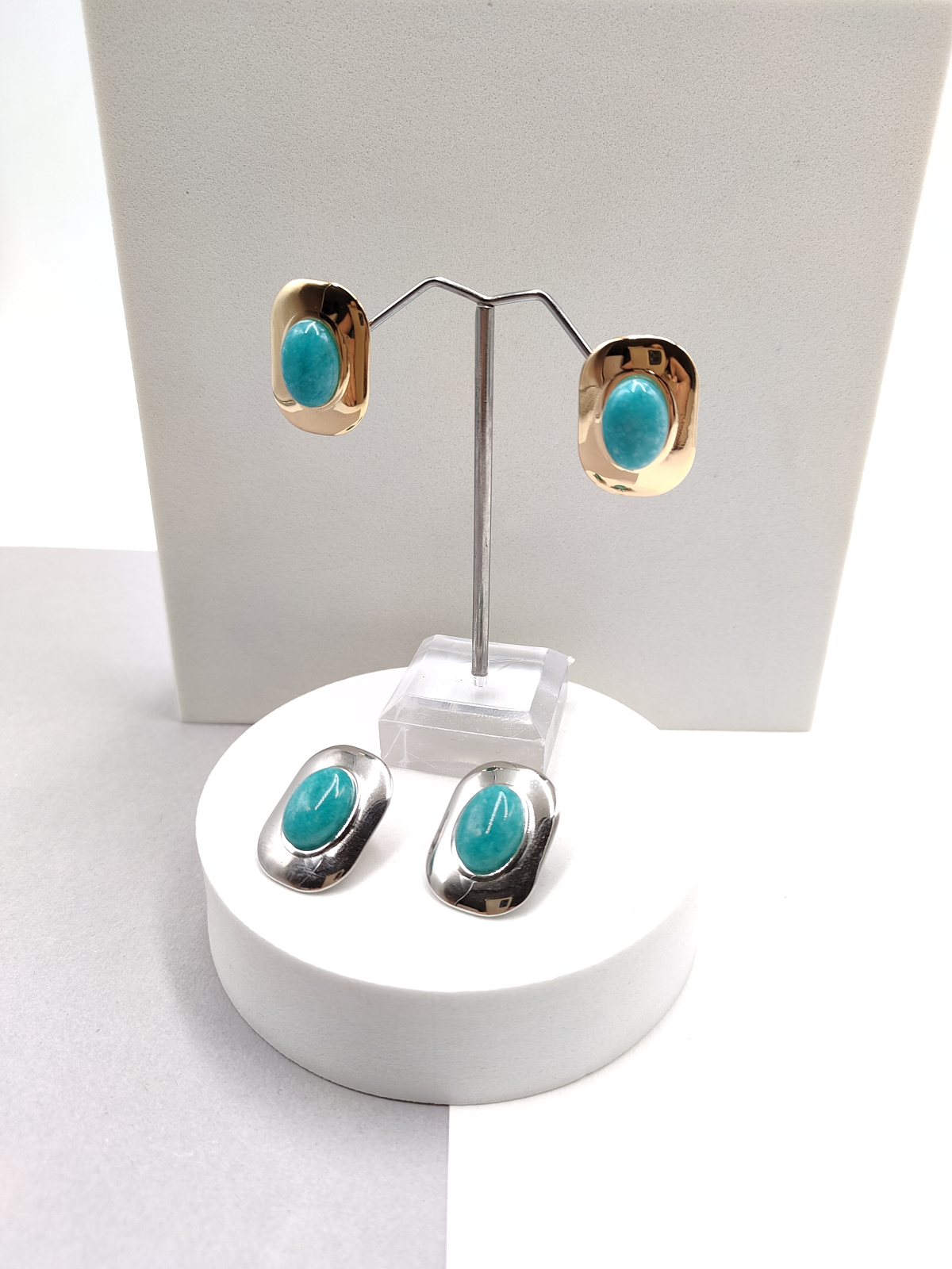 Σκουλαρίκια ατσάλινα με παραλληλόγραμμο σχήμα και οβάλ πέτρα χαολίτη, σε χρυσό ή ασημί χρώμα.