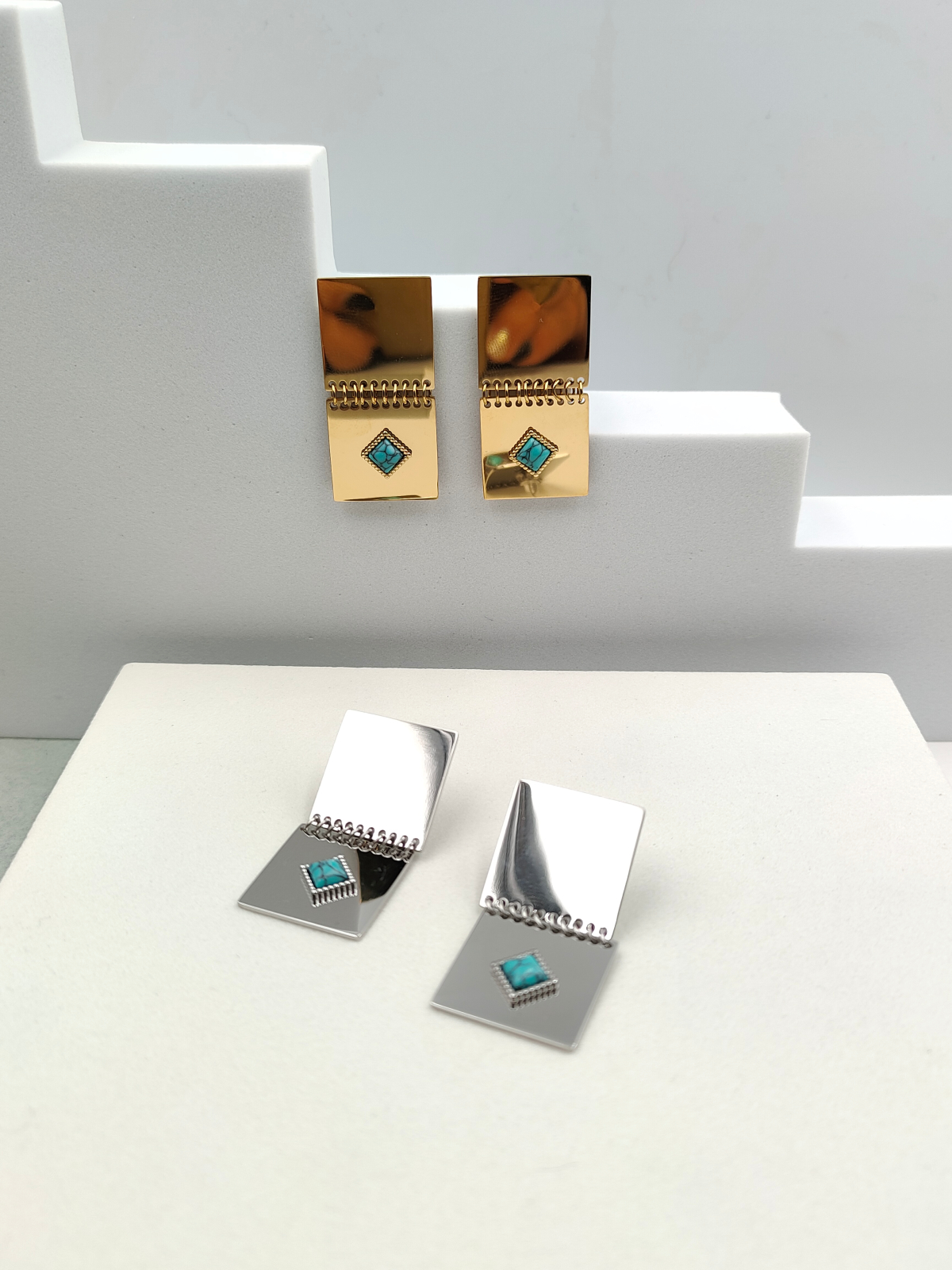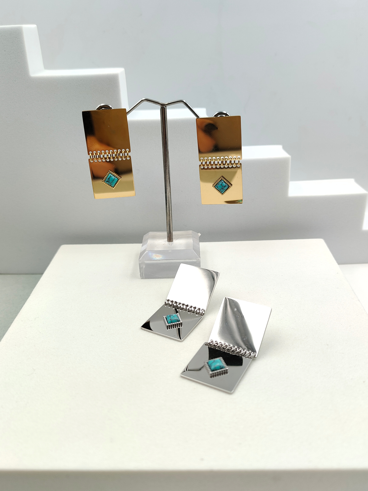 Σκουλαρίκια ατσάλινα με παραλληλόγραμμο σχήμα και πέτρες χαολίτη, σε χρυσό ή ασημί χρώμα.