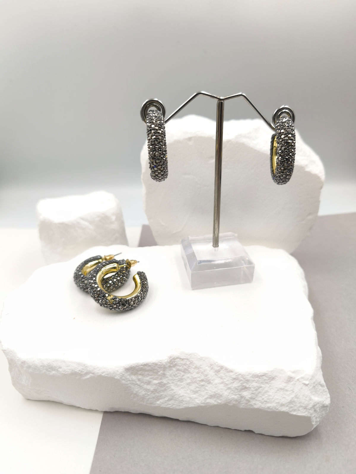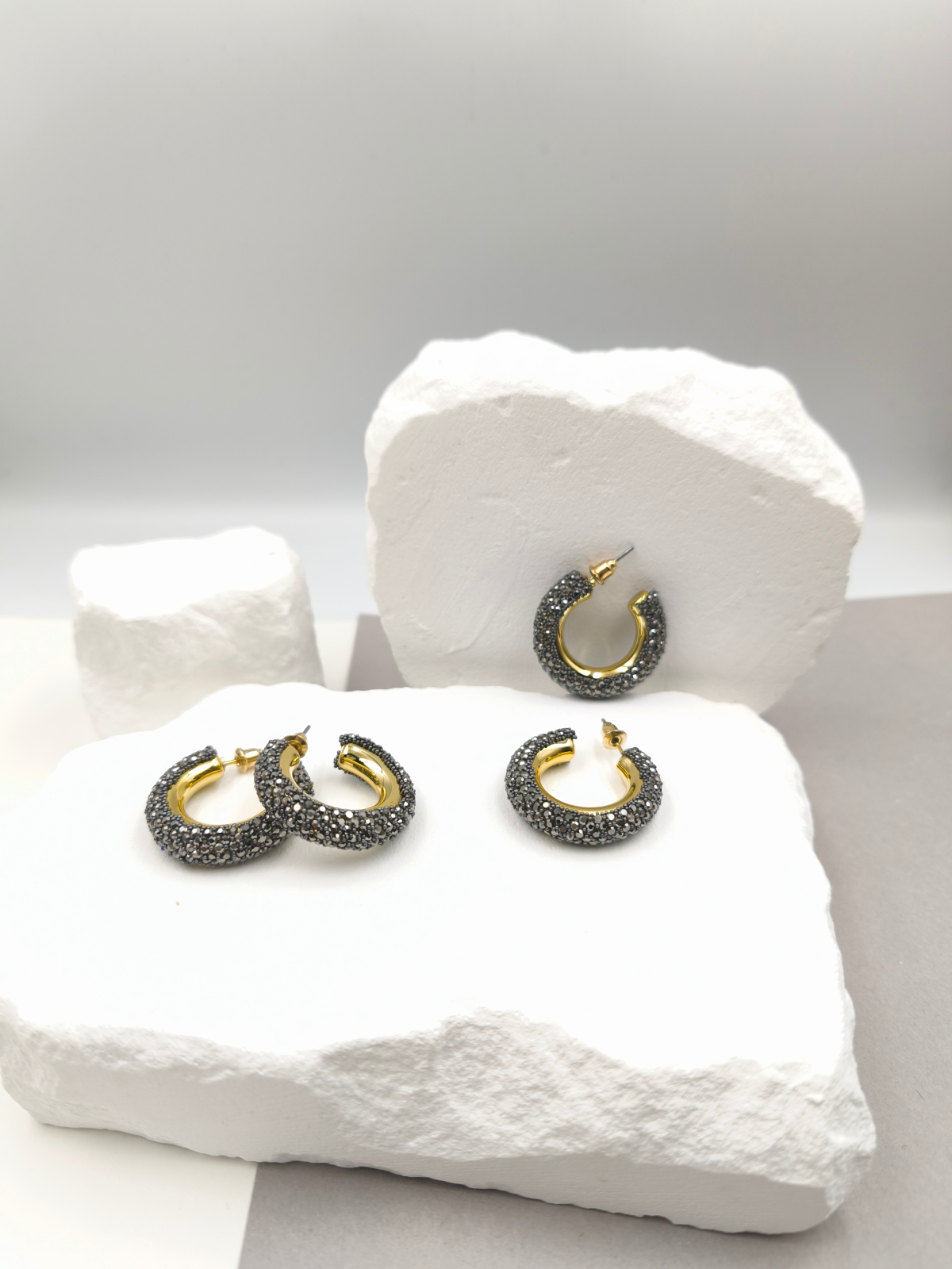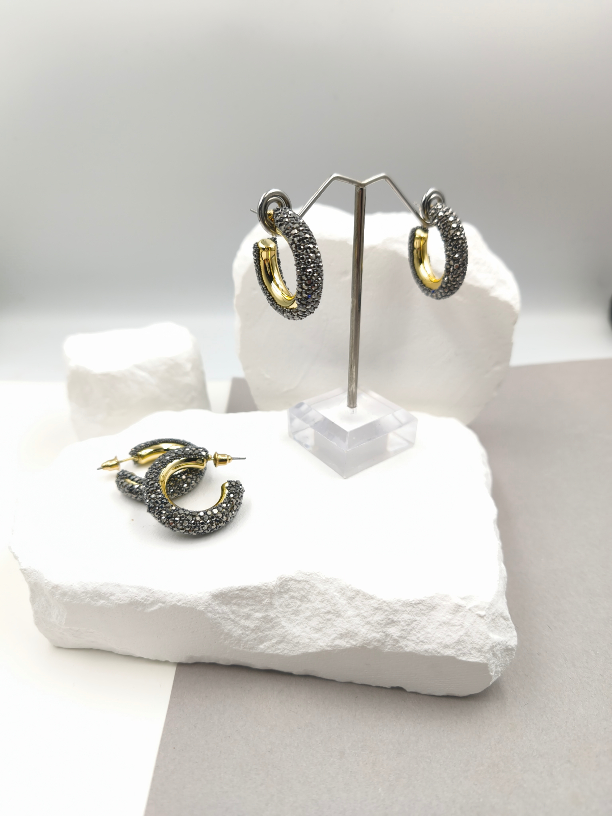 Σκουλαρίκια λεπτοί κρίκοι 3/4 με επίχρυση βάση, μαρκασίτη και στρας.