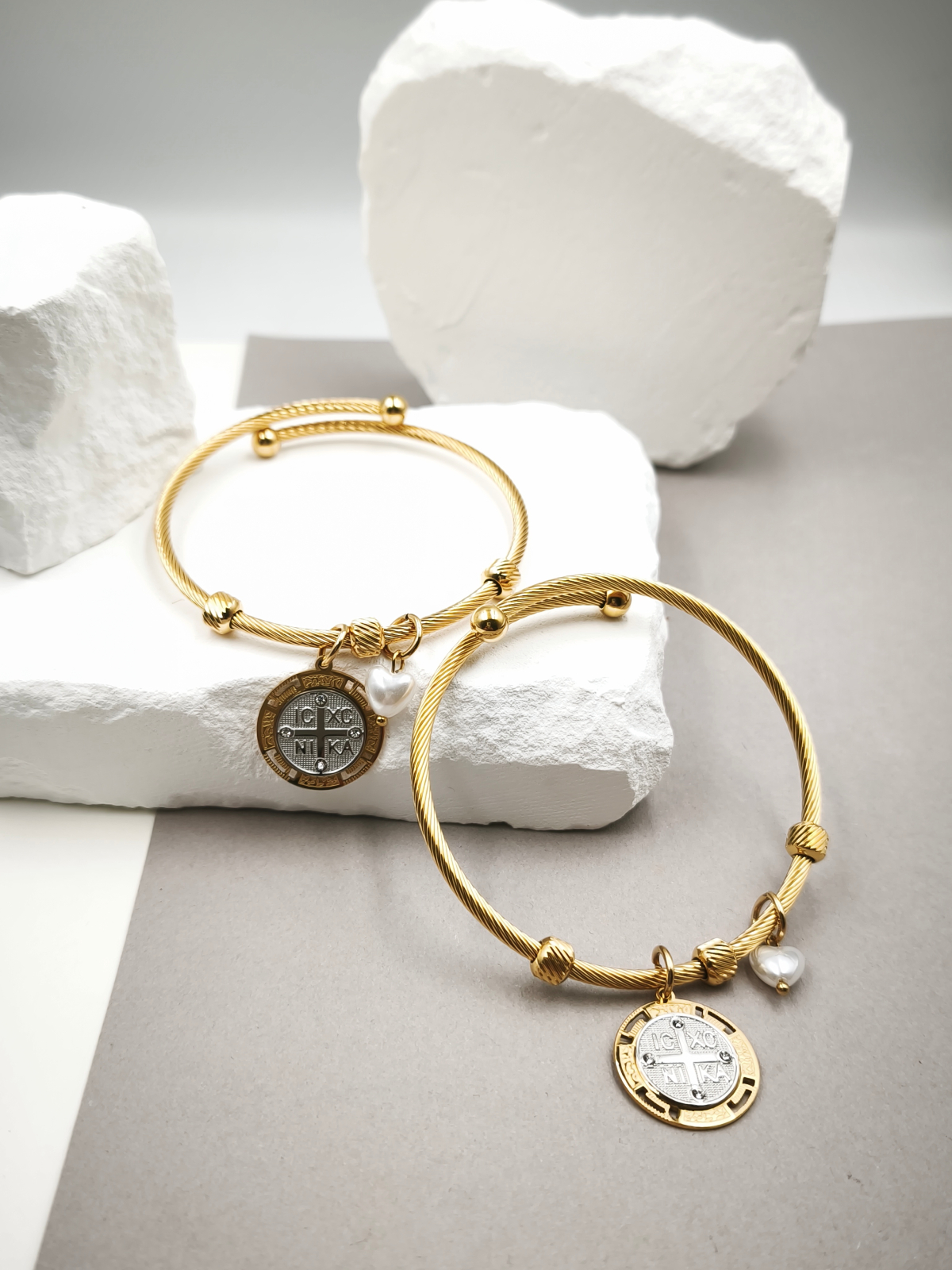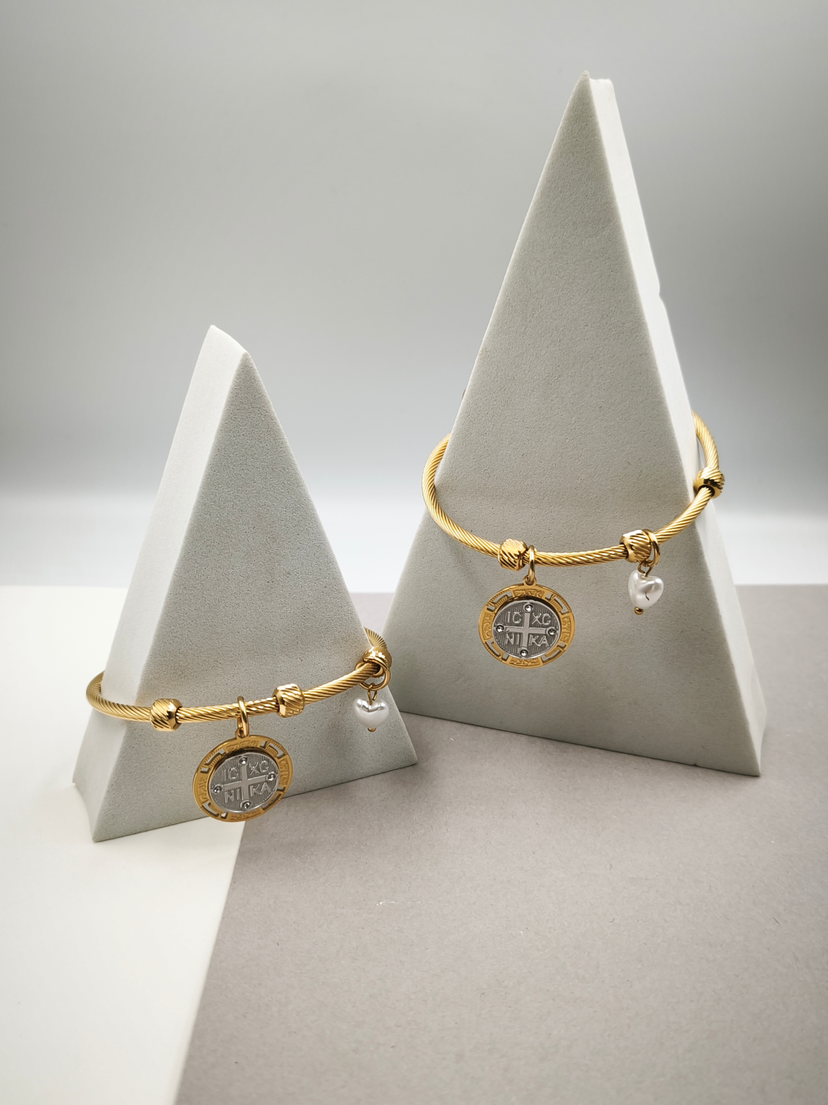 Βραχιόλι ατσάλινο με χρυσή βάση, ασημί ανάγλυφο φυλαχτό και μαργαριτάρι καλλιέργειας σε σχήμα καρδιάς.
