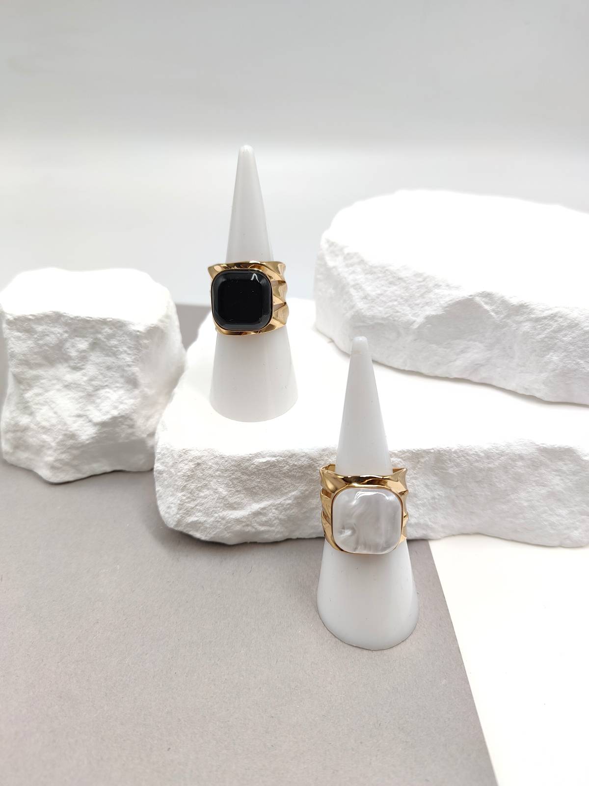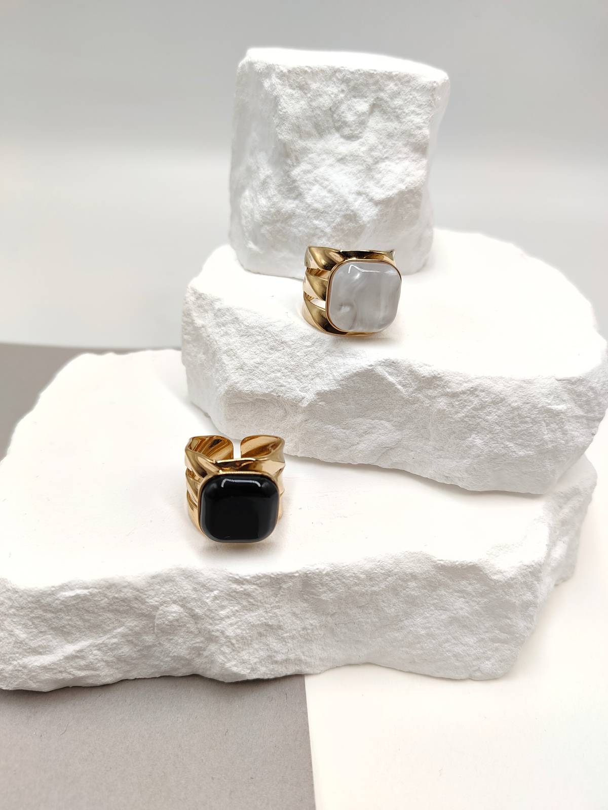 Δαχτυλίδι ατσάλινο με ανάγλυφη χρυσή βάση και πέτρα ρητίνης, σε λευκό, καφέ ή μαύρο χρώμα.