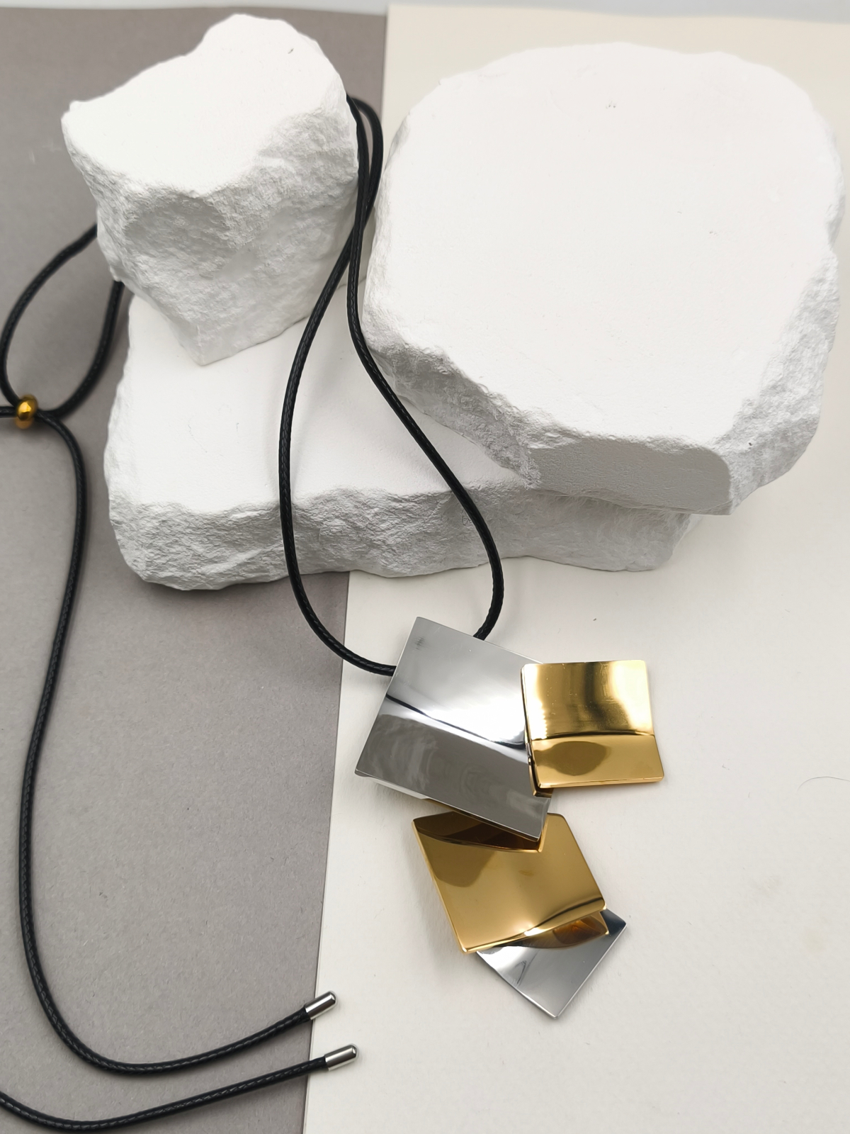 Κολιέ με κορδόνι και μεγάλο ατσάλινο μοτίφ με τετράγωνα σε χρυσό και ασημί χρώμα.