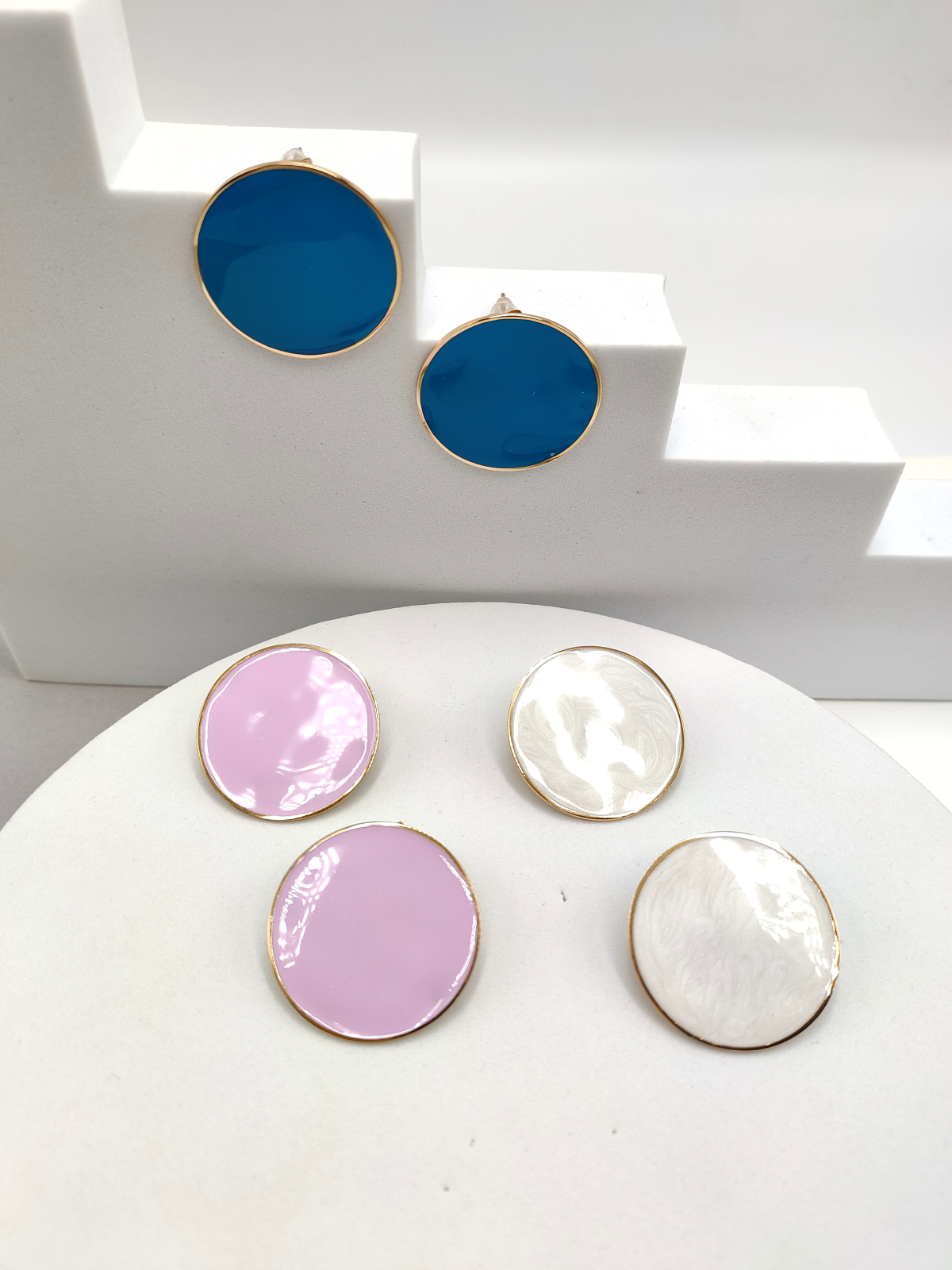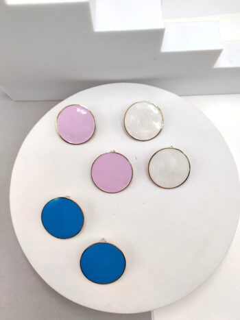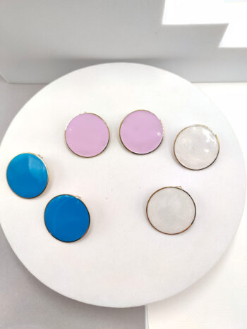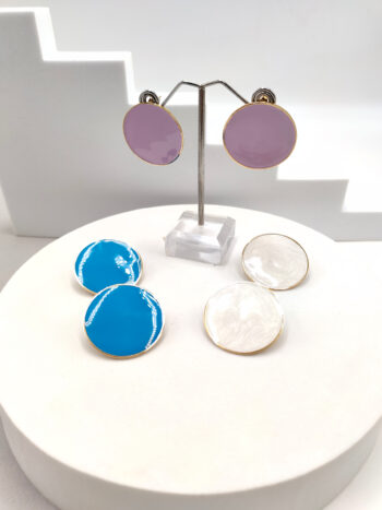 Σκουλαρίκια ατσάλινα με στρογγυλό σχήμα και σμάλτο, σε λευκό, λιλά ή γαλάζιο χρώμα.