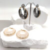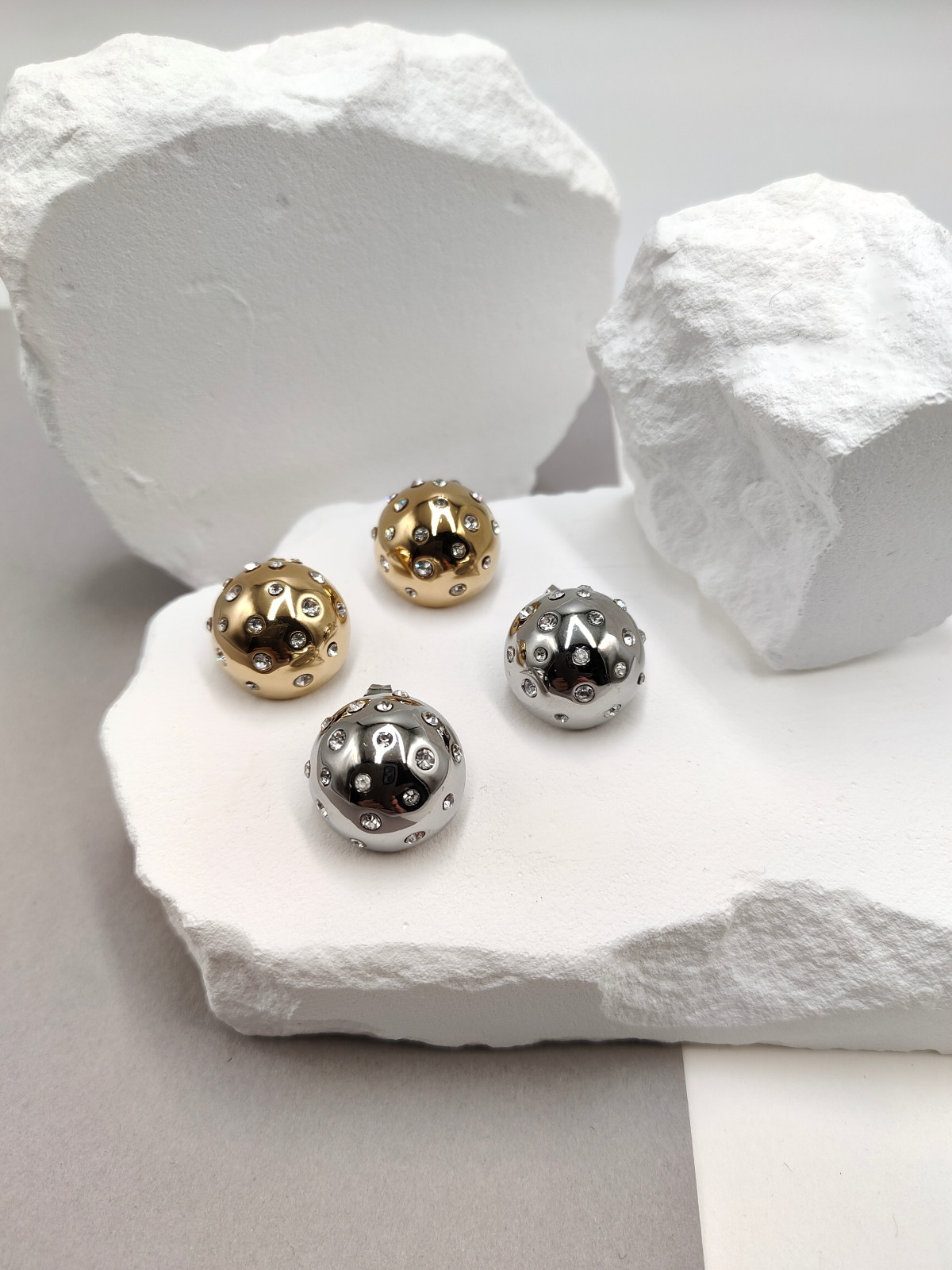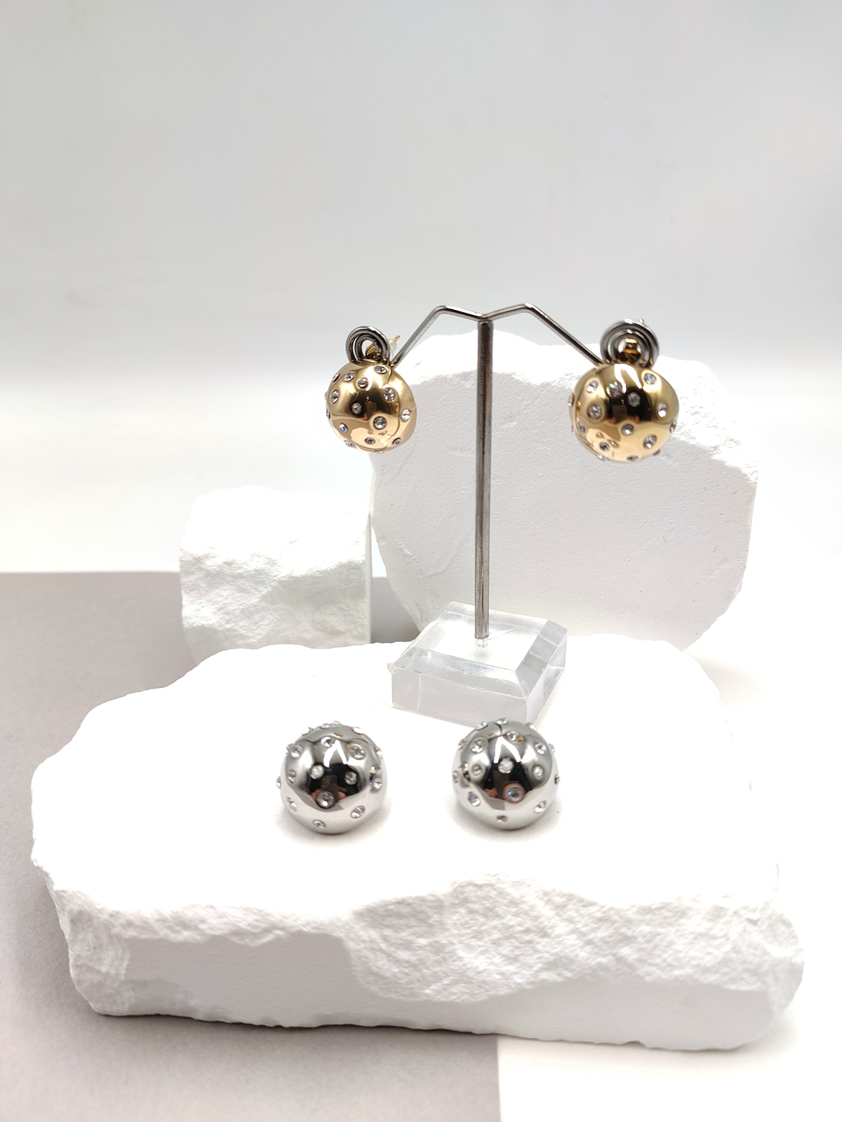 Σκουλαρίκια ατσάλινα με στρογγυλό σχήμα, πομπέ επιφάνεια και κρυσταλλα, σε χρυσό ή ασημί χρώμα.